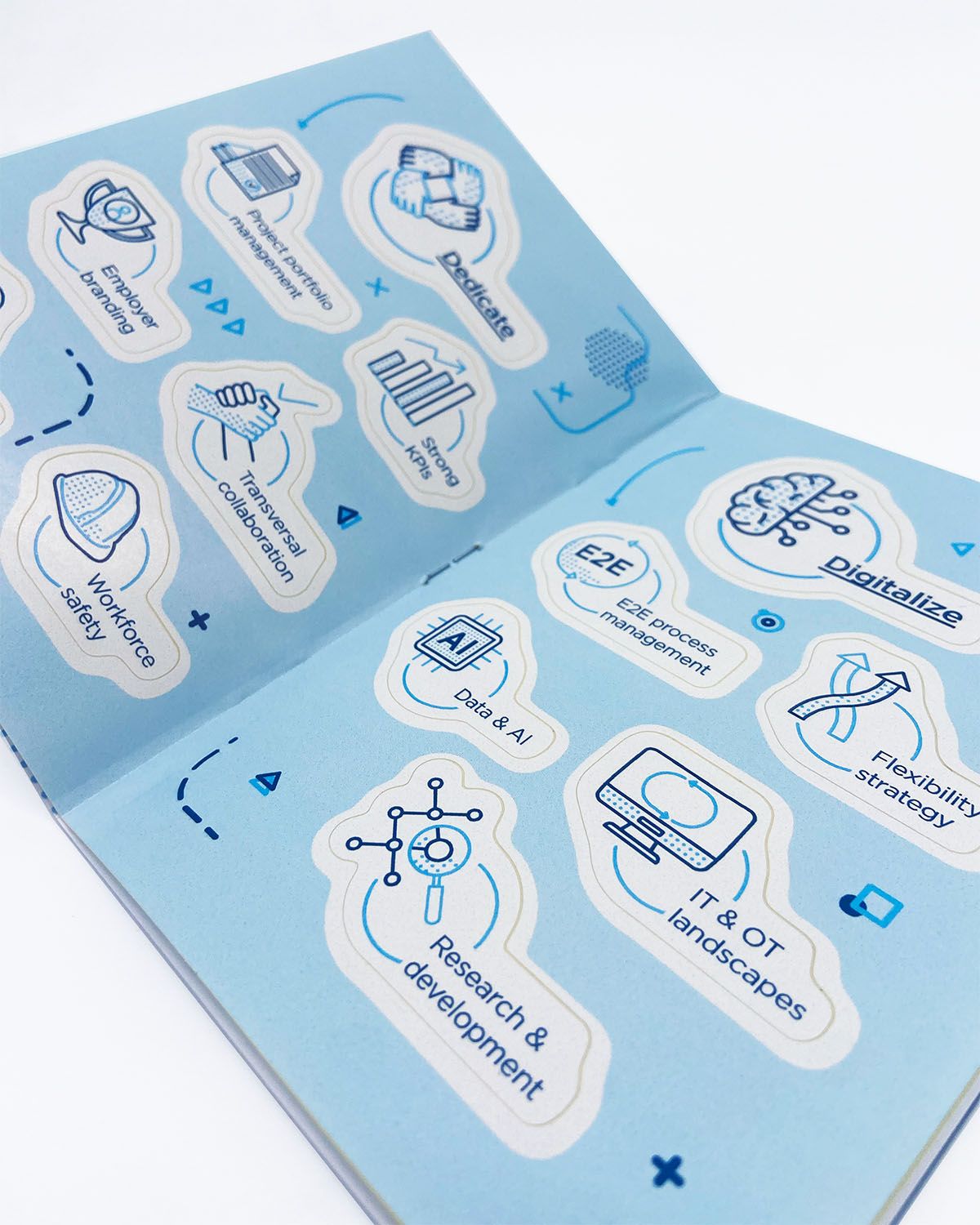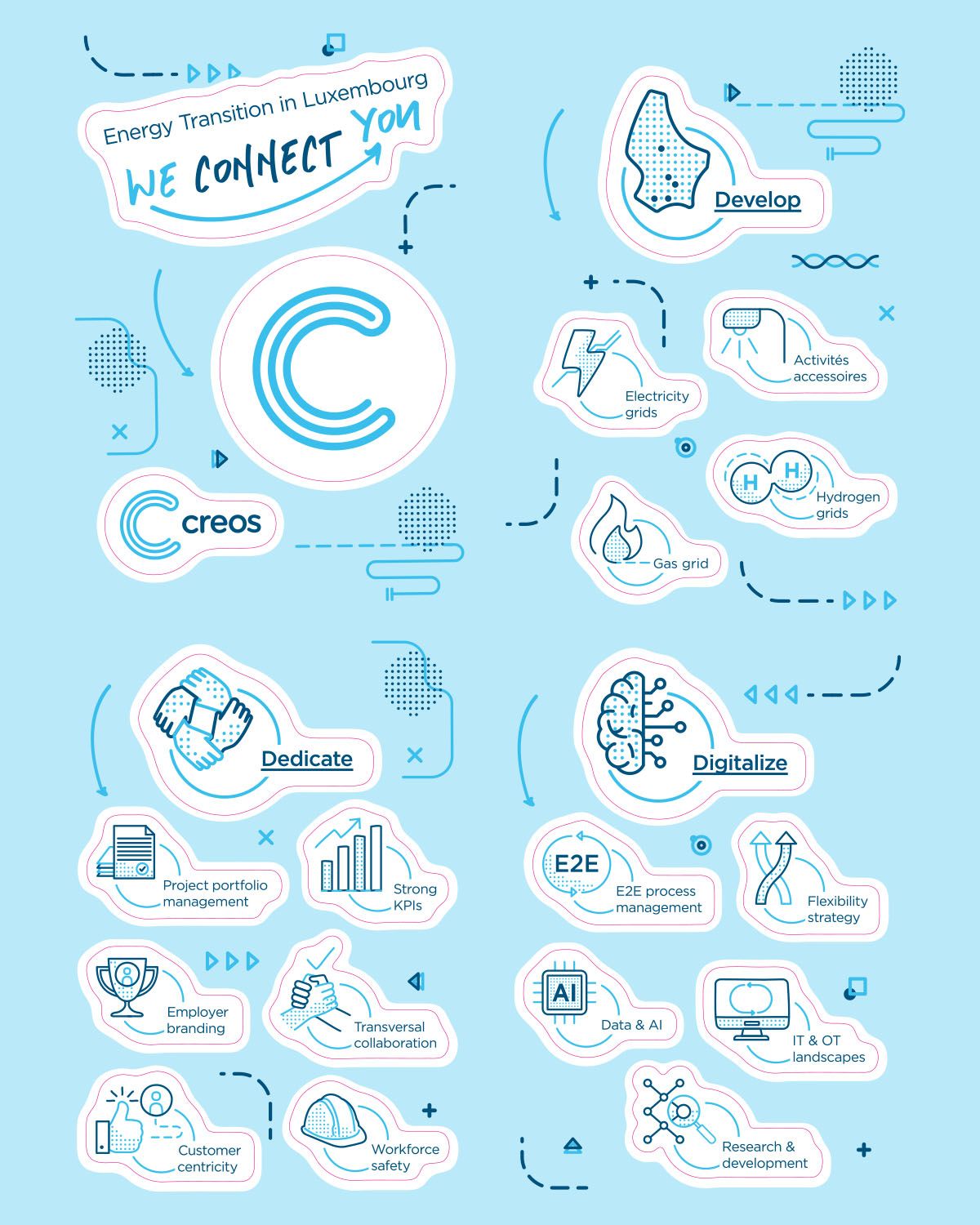 Find a consistent visual presentation style to illustrate the strategy Creos intends to pursue until 2030 and explain it using a small-format booklet and a PowerPoint presentation accompanied by short animations.