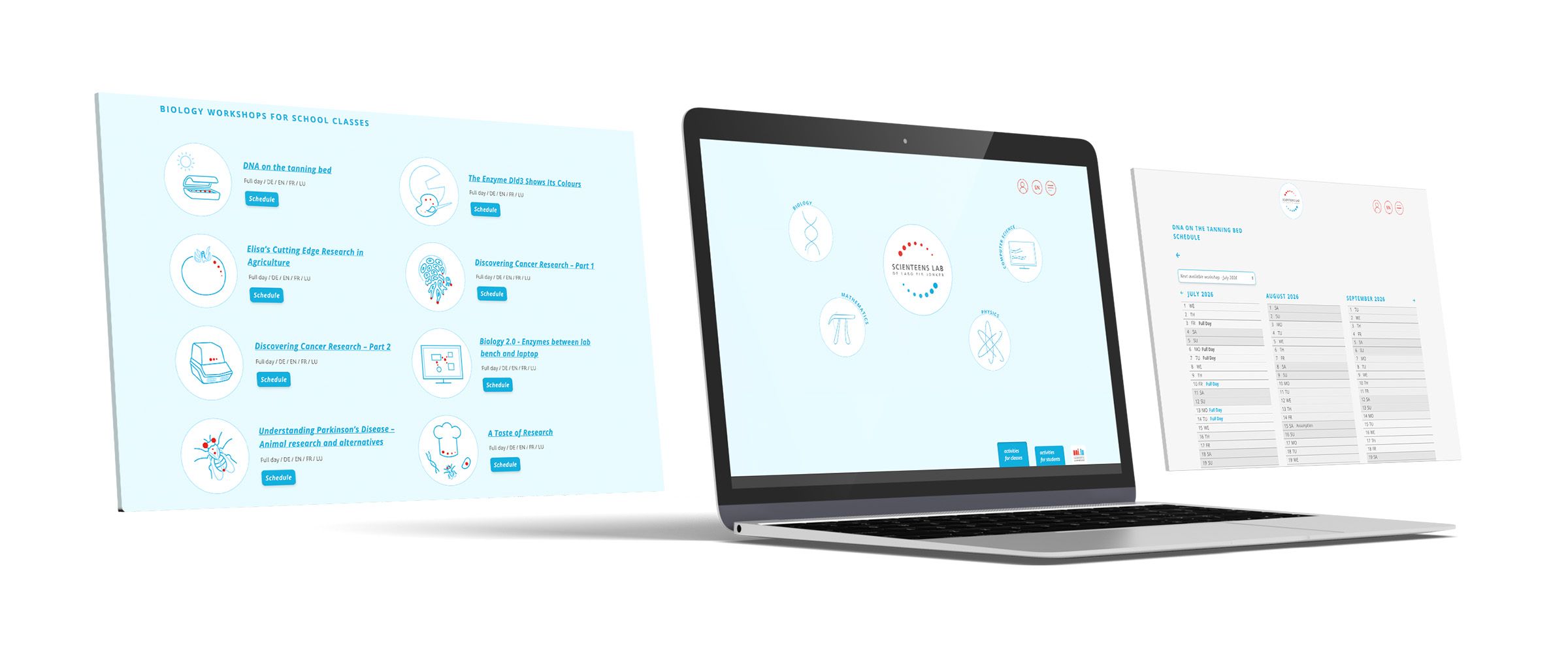 Graphical design and programming of a complete registration and management system for the various courses offered in the four disciplines of biology, mathematics, physics and computer science at the Scienteens Lab of the University of Luxembourg. Creation of a clear calendar overview and enabling course bookings for individuals as well as school classes, taking into account the very different availability of lecturers. After completion of the courses, automated generation of certificates for individual participants.